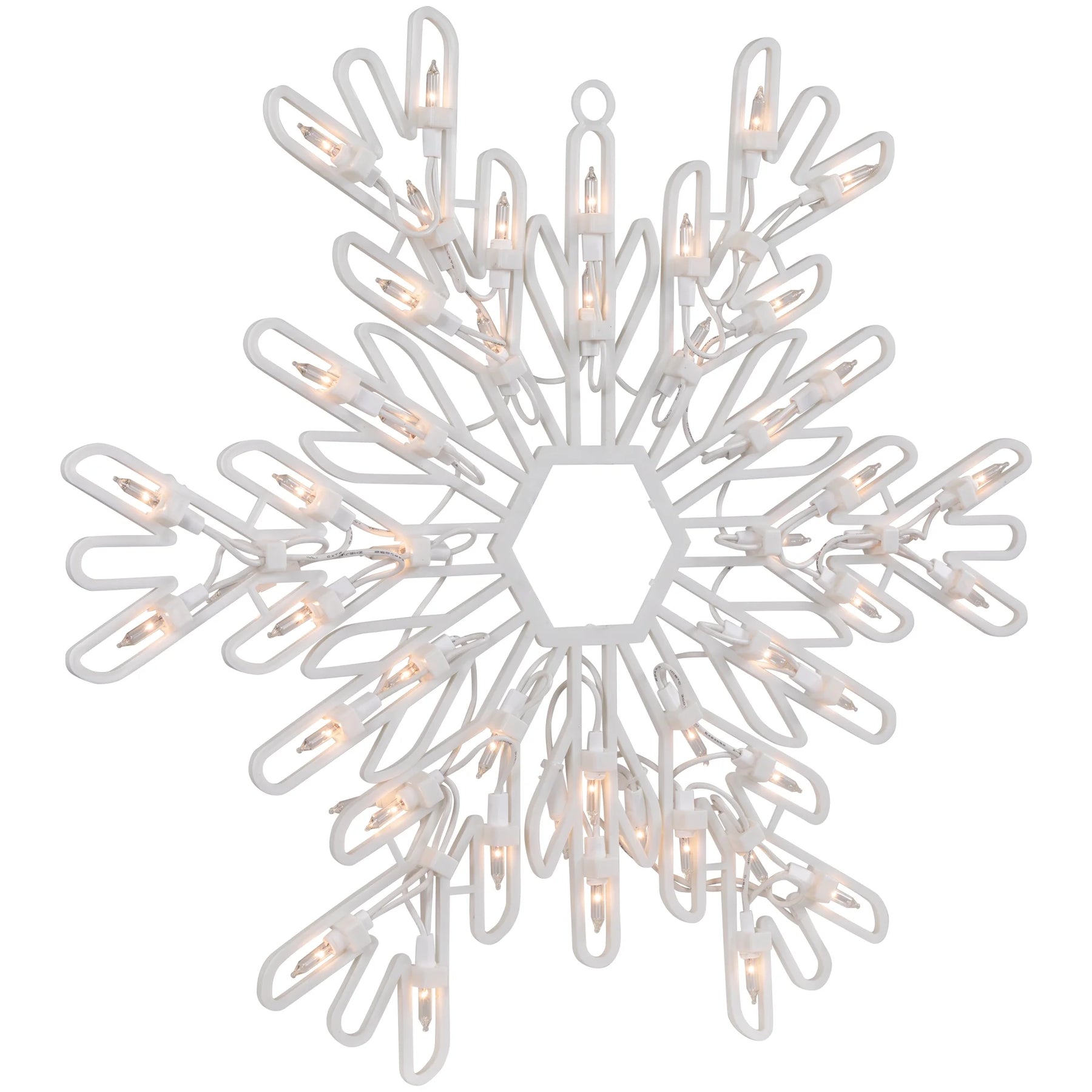 Add a touch of winter wonder to your holiday decor with our lighted snowflake window silhouette. This enchanting snowflake silhouette will transform any window into a festive focal point. The warm, inviting glow of the lights will create a cozy atmosphere, perfect for celebrating the season with friends and family. Bring the magic of snowfall indoors with this stunning Christmas decoration. Product Features: Color: clear bulbs / white wire. Number of bulbs: 48. Bulb size: mini bulb. 6' white lead cord. Double-sided design. Comes ready-to-hang on a clear cord. Comes fully assembled; suction cup included. Additional Product Features: Super bright bulbs. UL certified and approved for indoor and outdoor use. Spare replacement bulbs and an extra fuse. If one bulb burns out, the rest will stay lit. Contains 1 plug with end connector which allows you to stack multiple lighted items together (not to exceed 210 watts). Wire gauge: 22. 120 volts, 60 hertz, 17amps, 20.4 watts. . Dimensions: 15.25"H x 16"W x 0.50"D. Material(s): plastic/wire/glass bulb